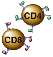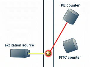 Figure shows anti-CD4 monoclonal antibodies coupled to FITC and anti-CD8 monoclonal antibodies coupled to PE binding to CD4 and CD8 positive lymphocytes, respectively.