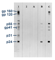 No bands present Bands at either p31 OR p24 AND bands present at either gp160 OR gp120 Bands present, but pattern does not meet criteria for positivity